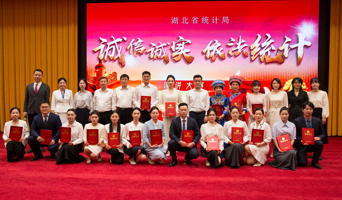 此次演讲大赛历时数月,全省各地积极响应、精心组织,逐级选拔出16组优秀选手进入决赛。决赛现场,16组选手精神饱满、激情昂扬,依次上台讲述亲身经历、分享思想感悟、畅谈心路历程,用一个个精彩的统计故事生动诠释“诚信诚实、依法统计”的价值底色和使命担当,为我们奉献了一场充满统计情怀的精神盛宴,充分彰显了新时代湖北统计人尊法崇实、锐意进取的昂扬风采。经过激烈角逐,决赛评选出一等奖4名、二等奖4名、三等奖8名,并现场颁发荣誉证书,合影留念。