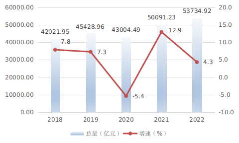 初步核算,2022年,全省生产总值为53734.92亿元,按可比价格计算,比上年增长4.3%。其中,第一产业增加值4986.72亿元,增长3.8%;第二产业增加值21240.61亿元,增长6.6%;第三产业增加值27507.59亿元,增长2.7%。三次产业结构由2021年的9.3:38.6:52.1调整为9.3:39.5:51.2。在第三产业中,交通运输仓储和邮政业、批发和零售业、住宿和餐饮业、金融业、房地产业、其他服务业增加值分别增长0.1%、1.7%、0.9%、5.6%、-2.7%、4.6%。人均地区生产总值为92059元,按可比价格计算,比上年增长3.4%。