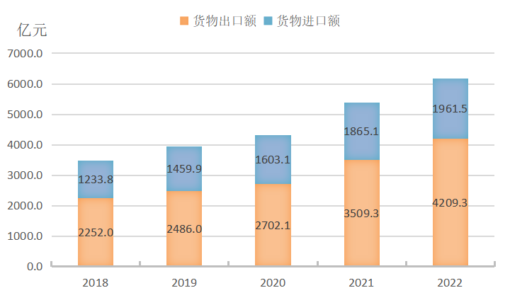 全年全省货物进出口总额6170.8亿元,比上年增长14.9%,其中,进口1961.5亿元,增长5.4%;出口4209.3亿元,增长20.0%。全省对前三大贸易伙伴东盟、欧盟、美国进出口额分别为982.1亿元、755.9亿元和674.0亿元,其中,对东盟、欧盟进出口额分别增长32.1%、8.8%。全省对RCEP成员国进出口额1884.3亿元,增长17.8%,占比为30.5%;对“一带一路”沿线国家进出口额1918.1亿元,增长33.7%,占比为31.1%。