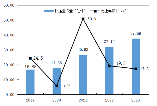 图7 2019-2023年全省快递业务量及增速