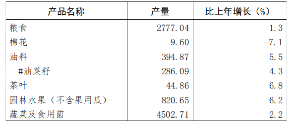 全年油料产量394.87万吨,比上年增长5.5%;茶叶产量44.86万吨,增长6.8%;园林水果产量820.65万吨,增长6.2%;蔬菜及食用菌产量4502.71万吨,增长2.2%。