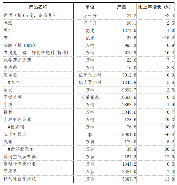 表2 2023年全省规上工业主要产品产量及其增速