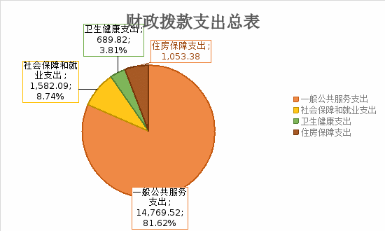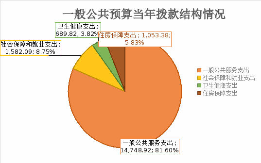 一般公共服务支出14748.92万元,占81.60%;社会保障和就业支出1582.09万元,占8.75%;卫生健康支出689.82万元,占3.82 %;住房保障支出1053.38万元,占5.83%。